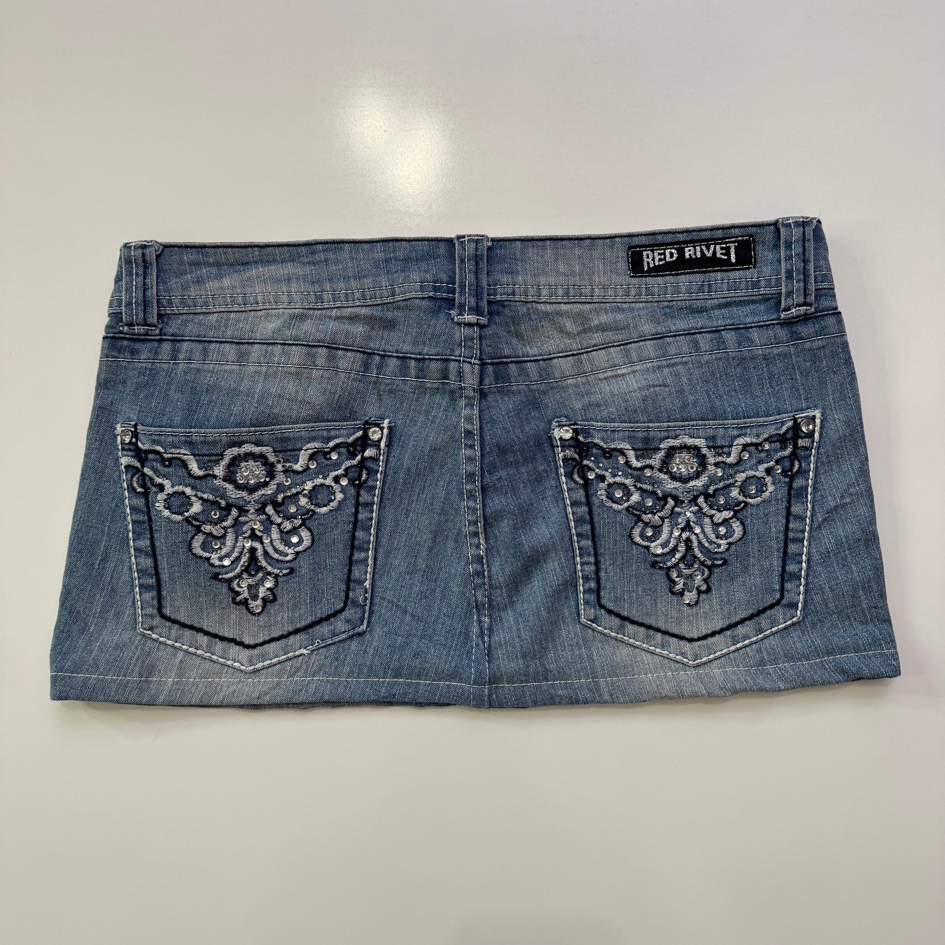 Gorg 00s low rise denim mini skirt with embroidered pockets & diamanté details 🪽