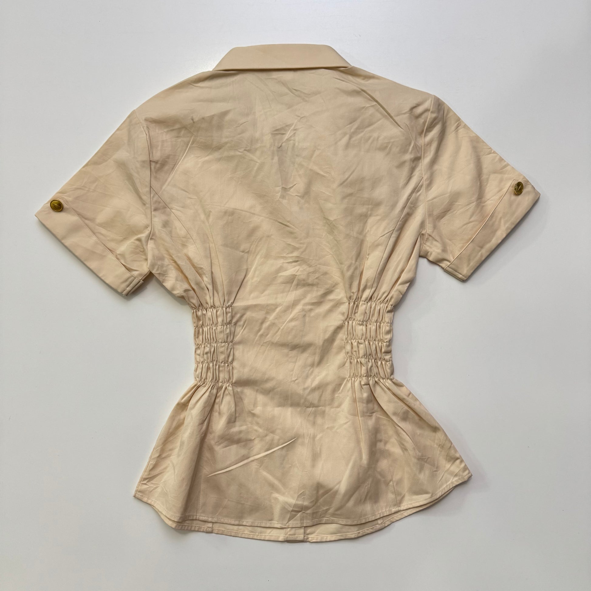 Love this beige button up blouse with cinched waist & cute gold buttons 💫