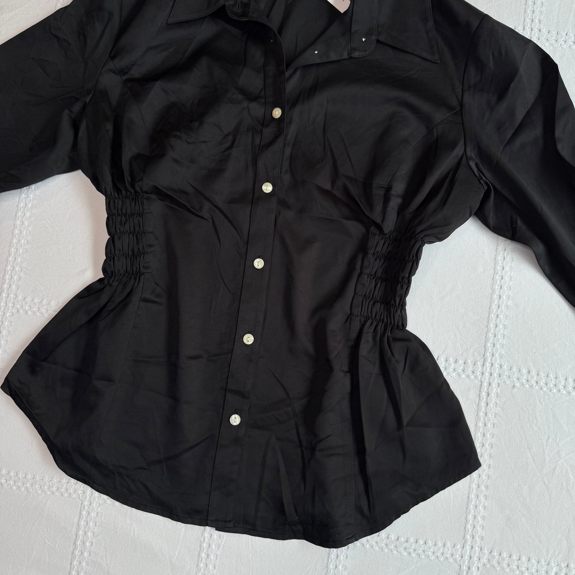Staple flattering black satin button up blouse with cinched waist 🍸