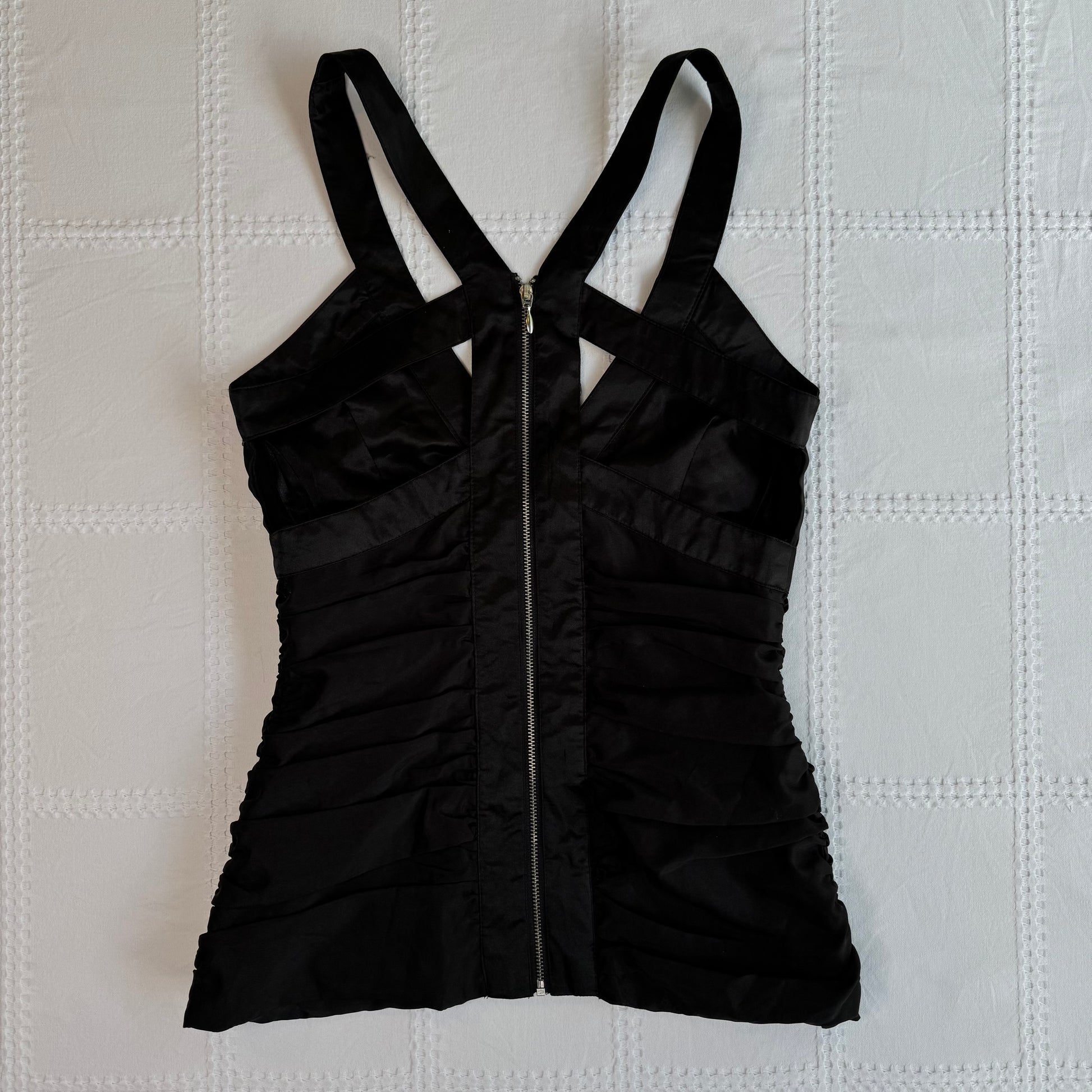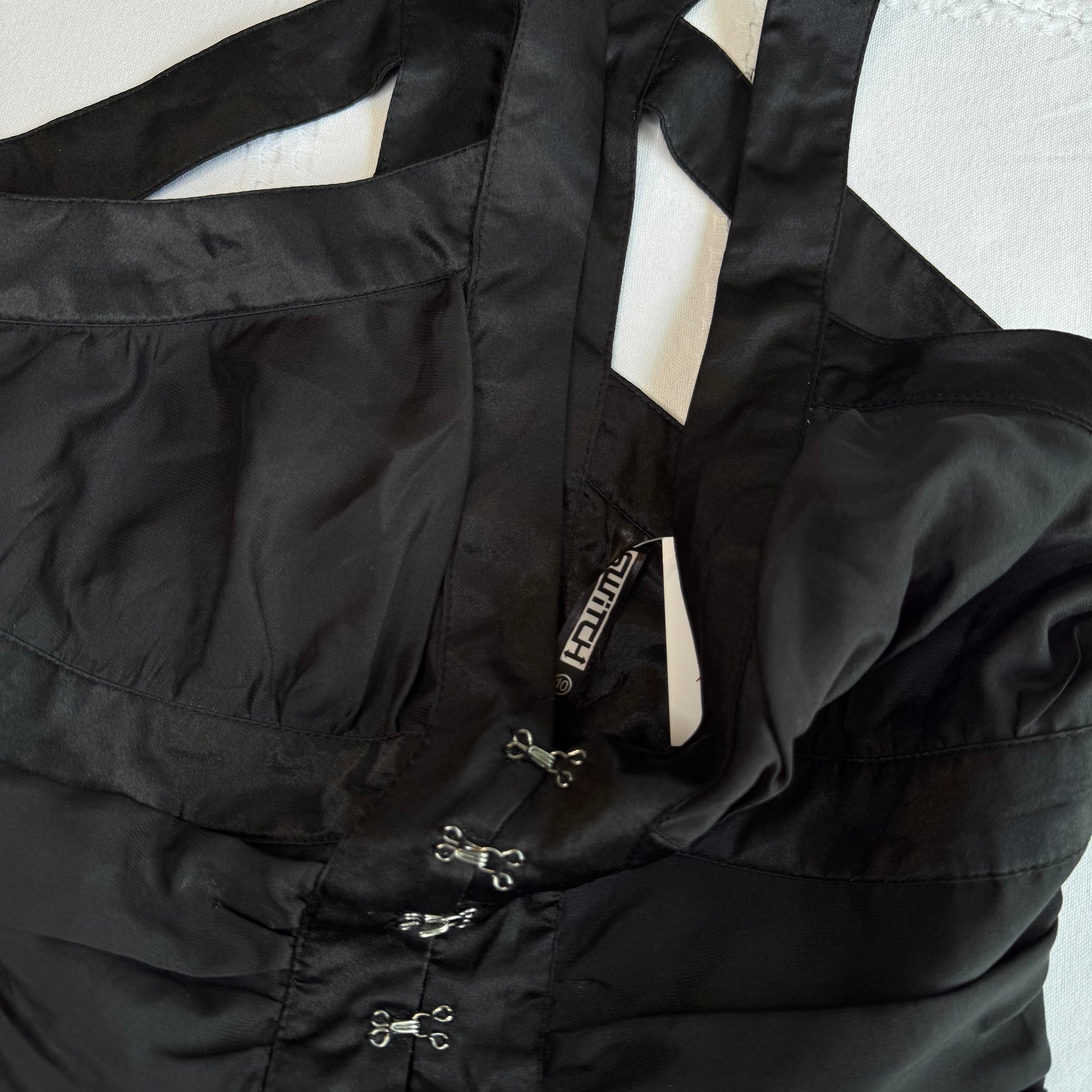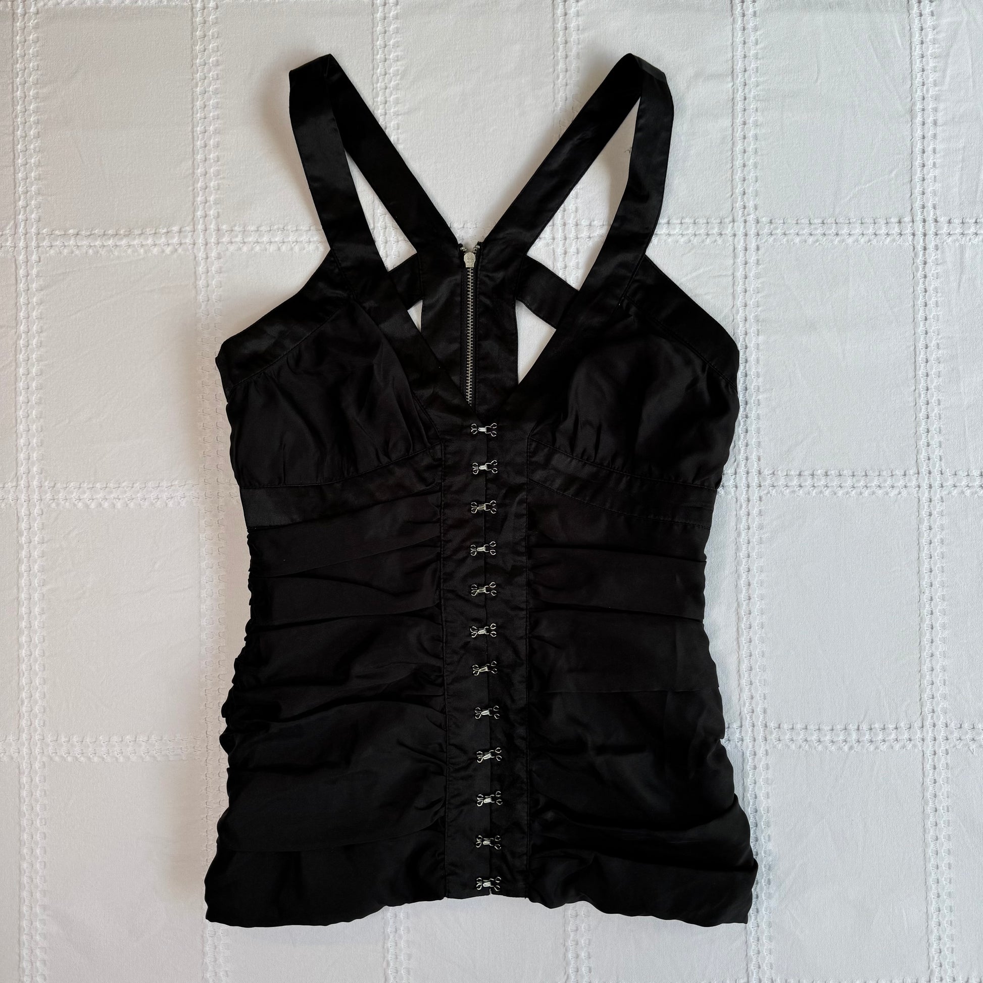 Coolest 00s black ruched babydoll top with hook & eye design 🪽