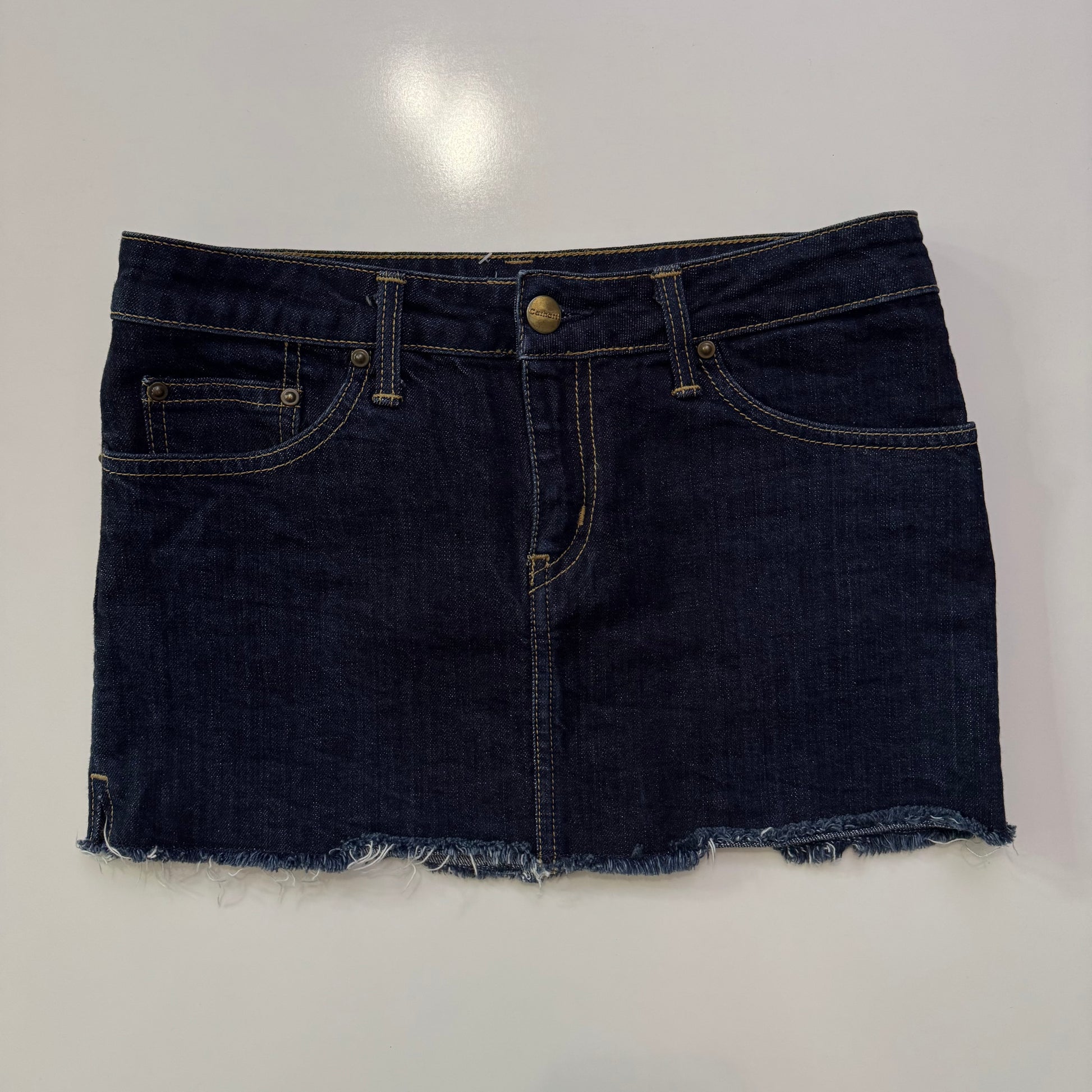 Staple 00s Carhartt low rise dark wash denim mini skirt with little logo detail & raw hem 🎱