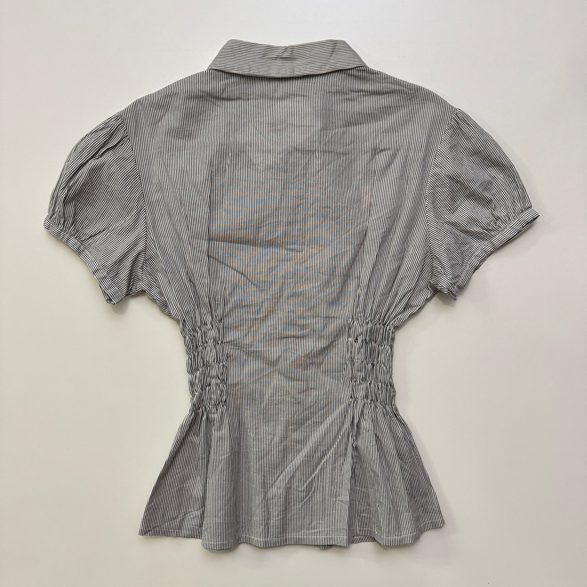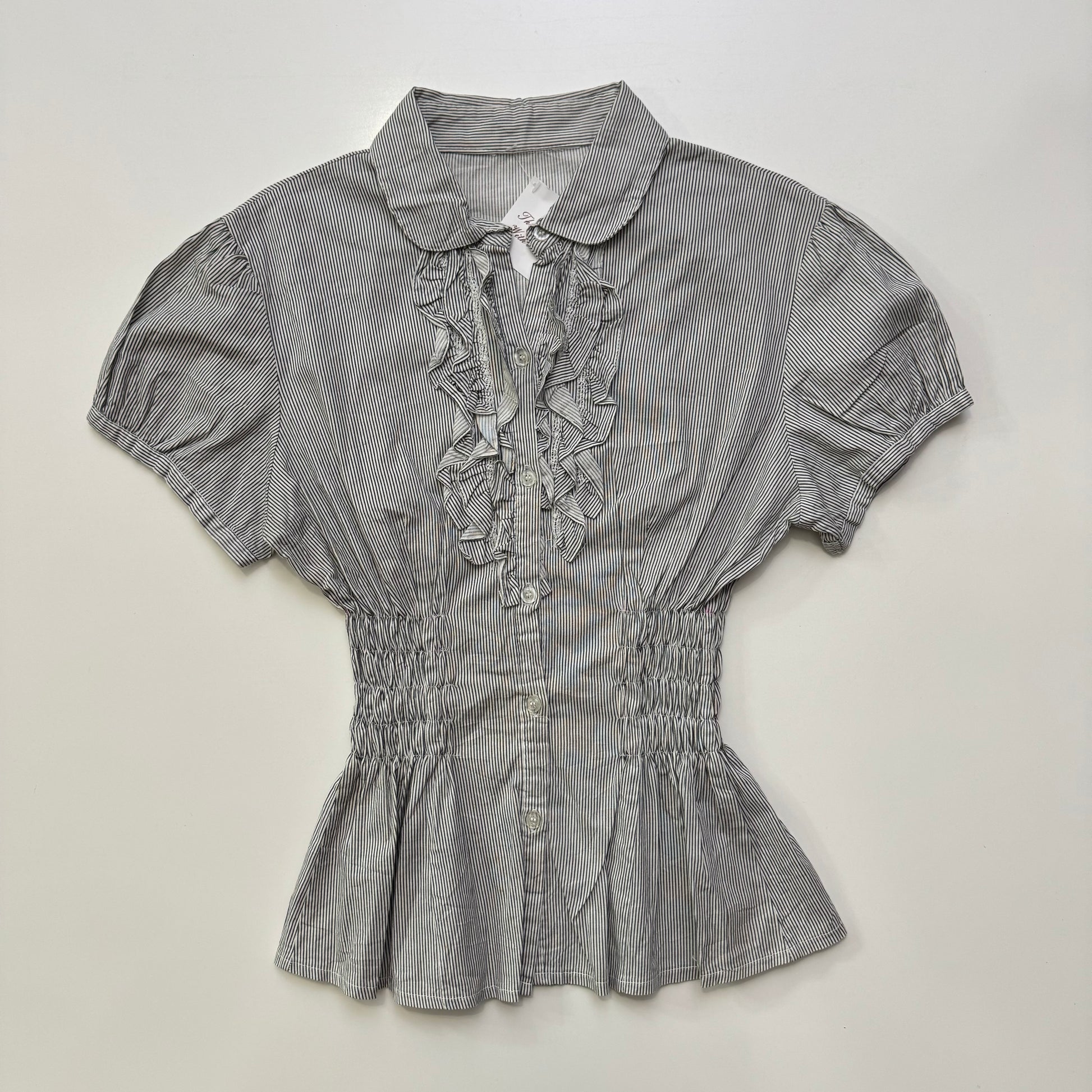 Super cute pinstripe button up blouse with cinched waist & ruffle collar 💘