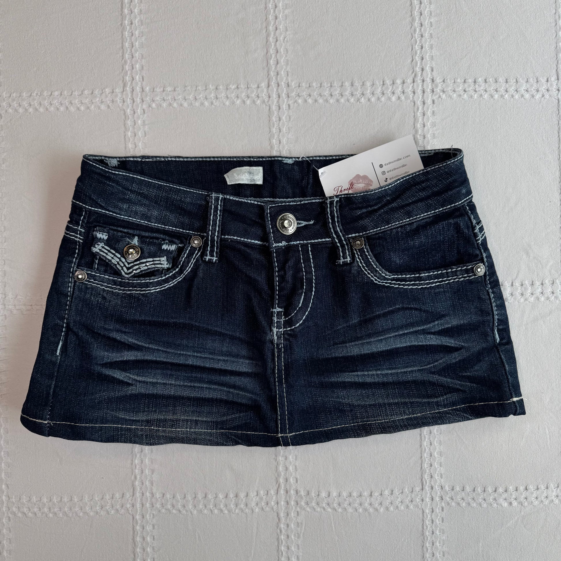 Super cute 00s low rise denim micro mini skirt with contrast stitching and embellished pockets 💟