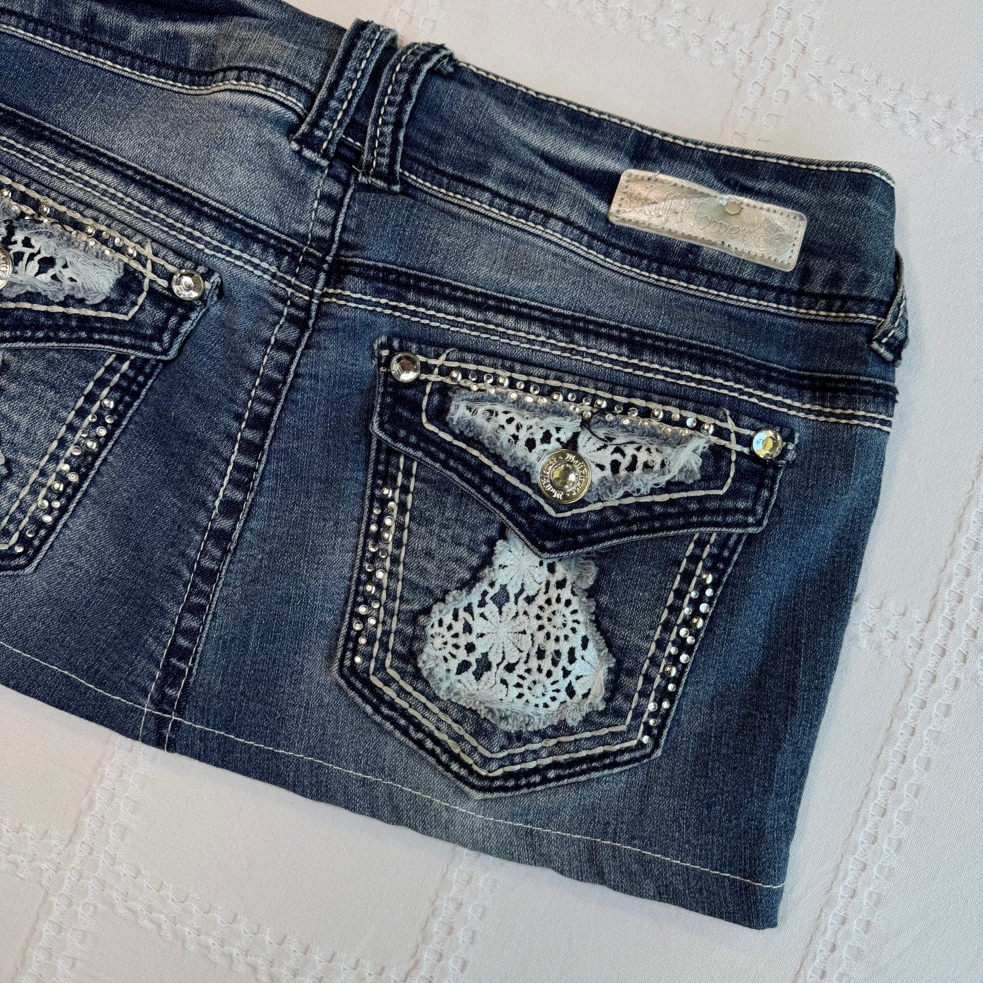 Cutest 00s low rise denim micro mini skirt 🎀 Love the lace & diamanté pocket detailing 🌷