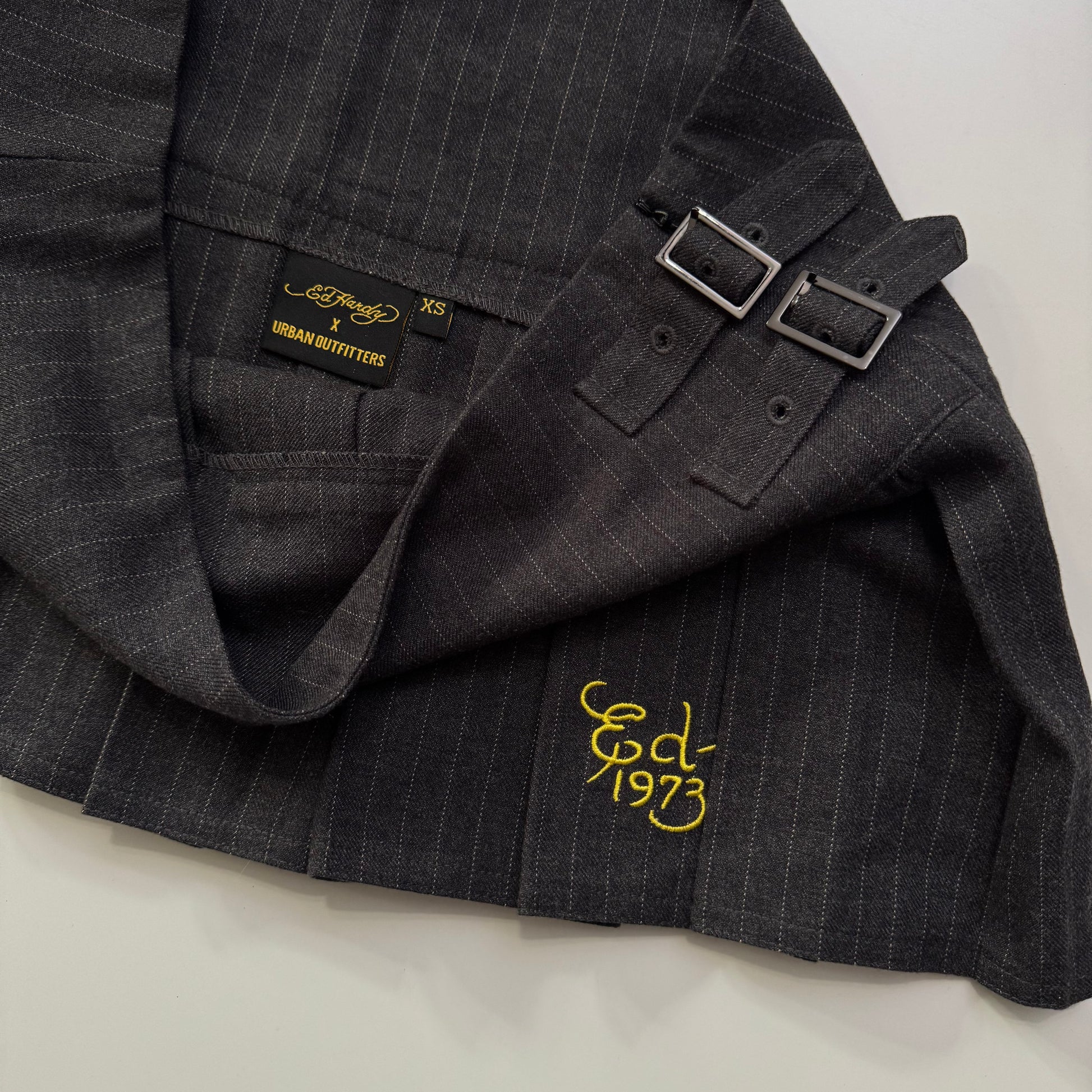 Insanely cute Ed Hardy x Urban Outfitters grey low rise pleated mini skirt with embroidery & buckle details 💛