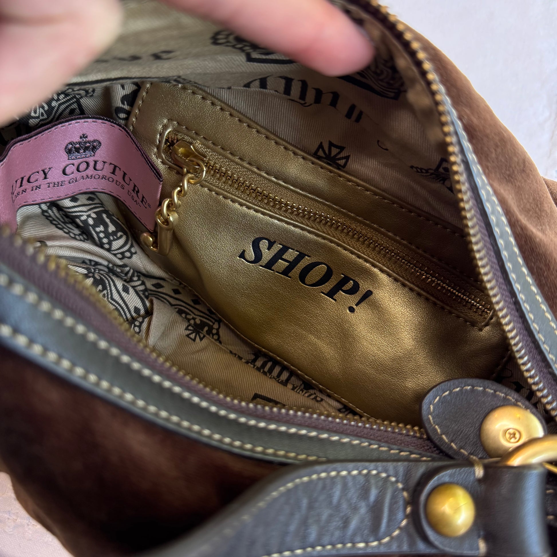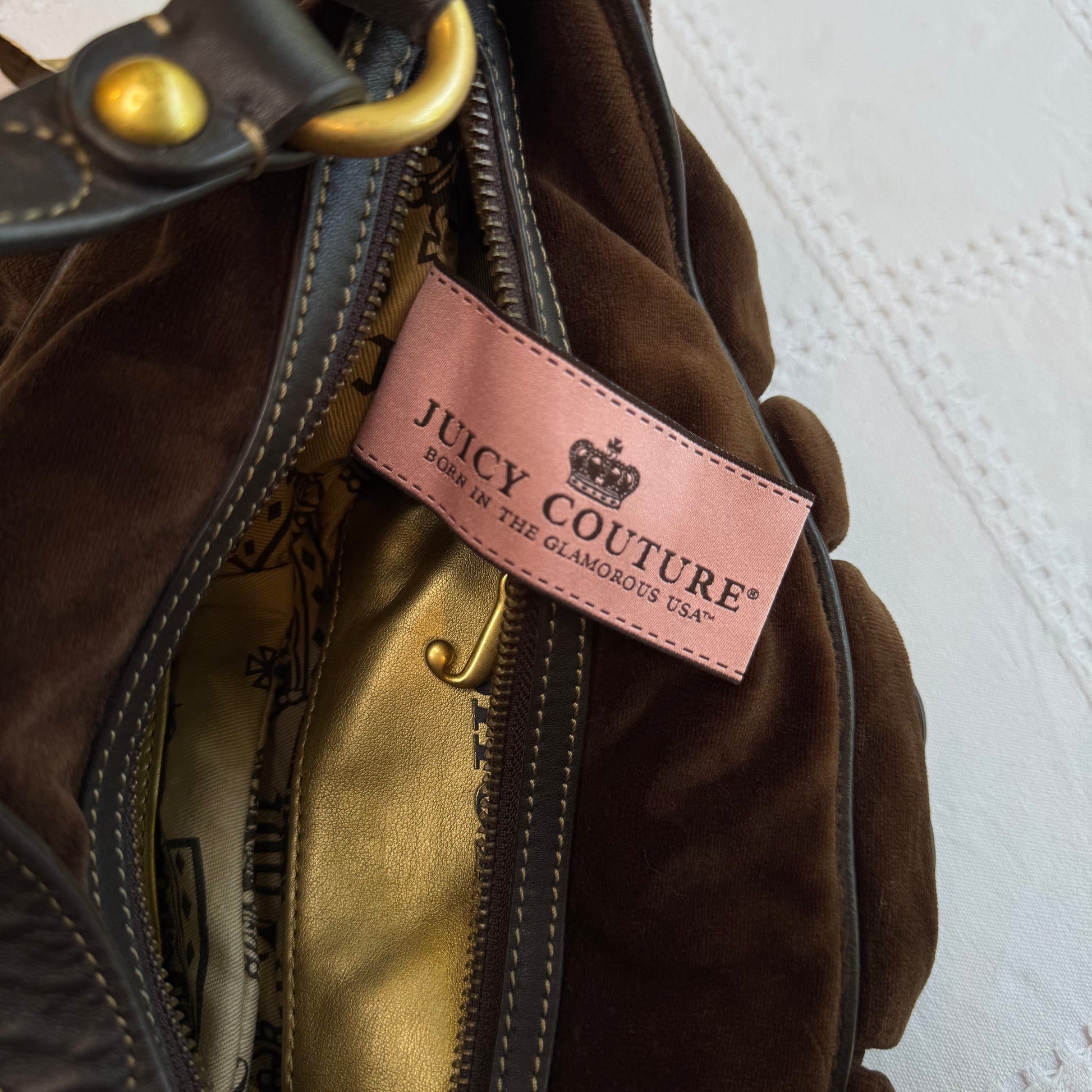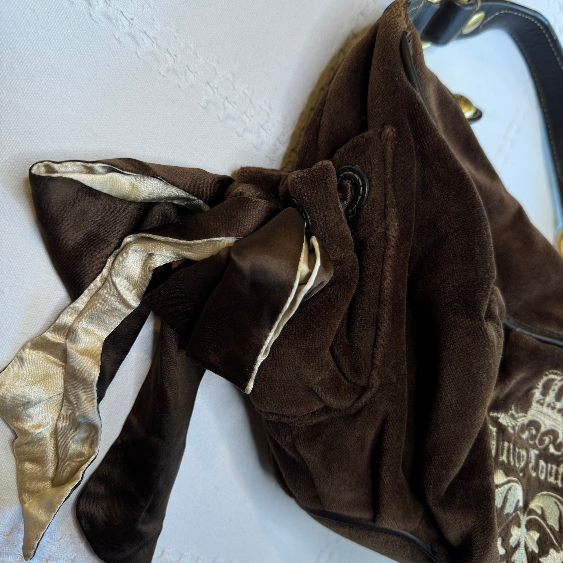 To die for rare vintage 00s Juicy Couture brown velour mini hobo shoulder bag 🤎 Cute logo embroidery with silky bow & charm details! Inside of the bag is just as cute 🥹