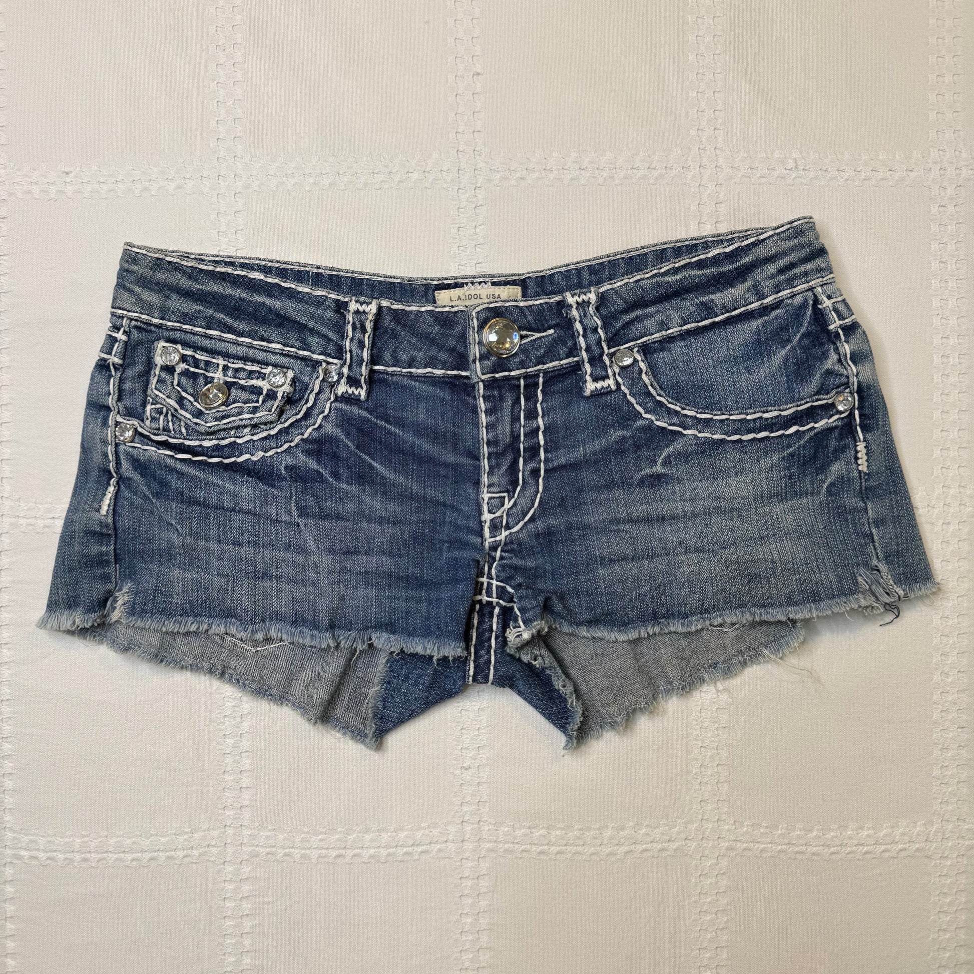 Must have 00s L.A. Idol ultra low rise light wash denim mini shorts with the iconic contrast stitching & cute diamanté buttons 💘