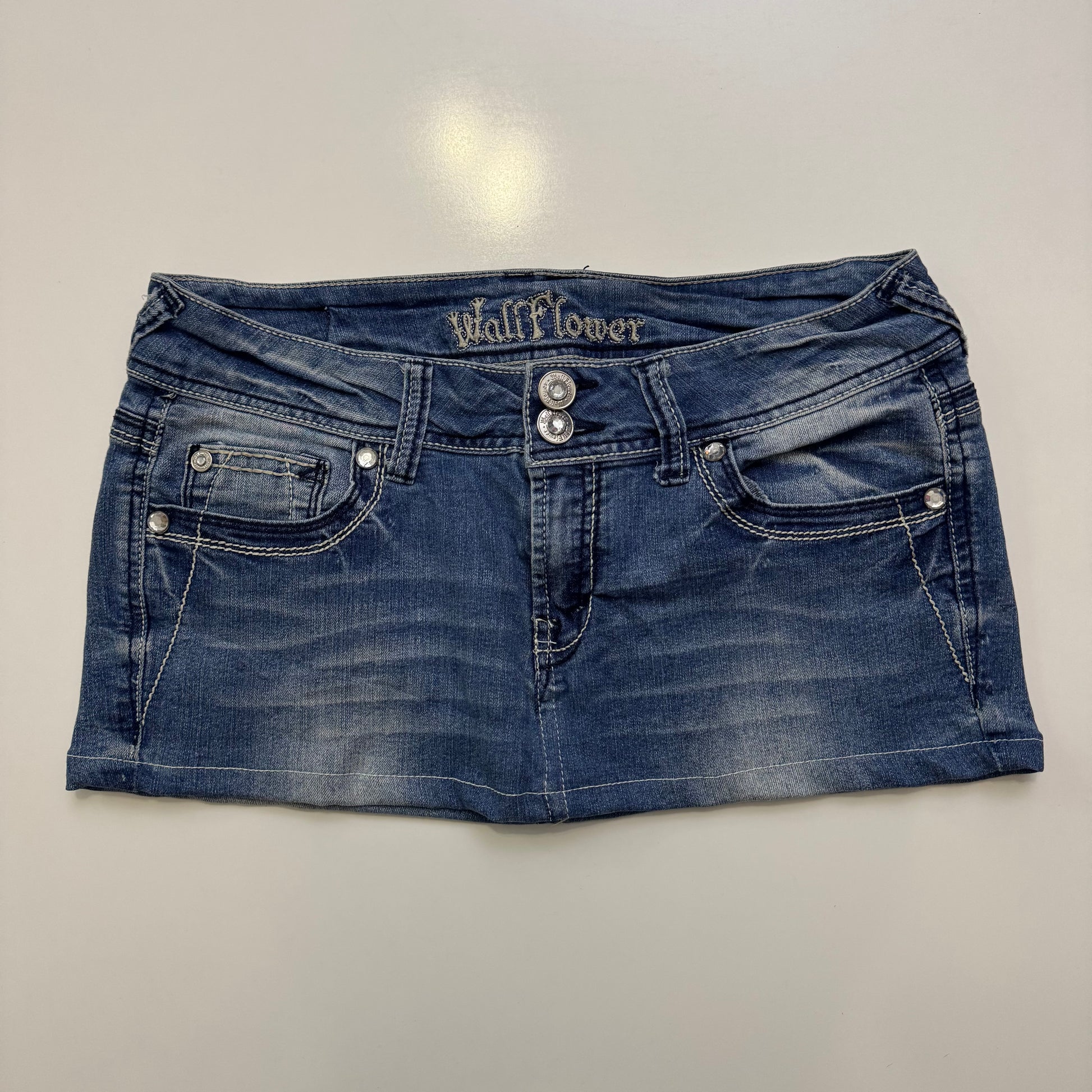 Adorable 00s low rise denim micro mini skirt with peekaboo lace pockets & diamantés 🎀 So flattering