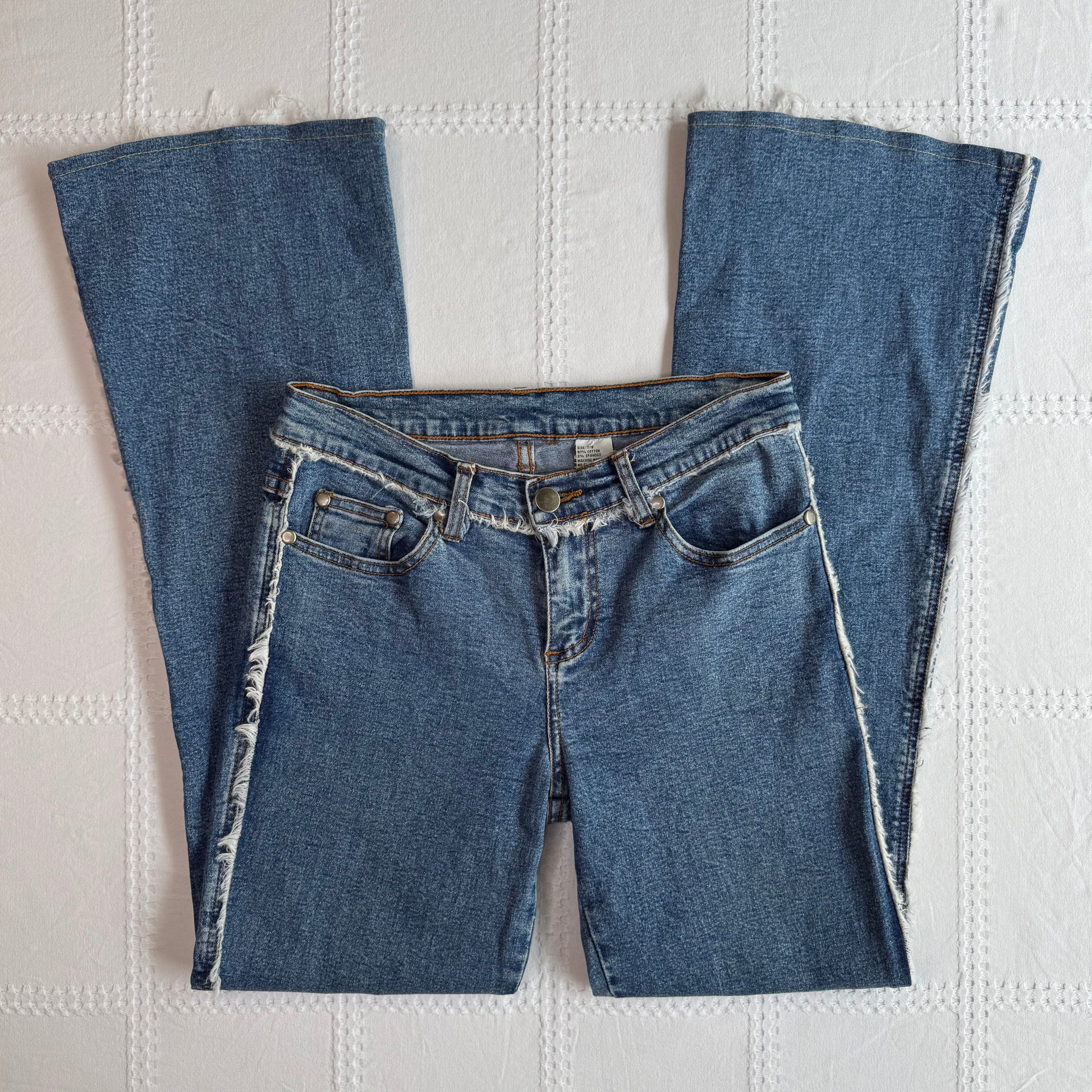 Super cool 00s low-mid rise flared jeans with fringe trim 🍒 Flattering stretchy denim!