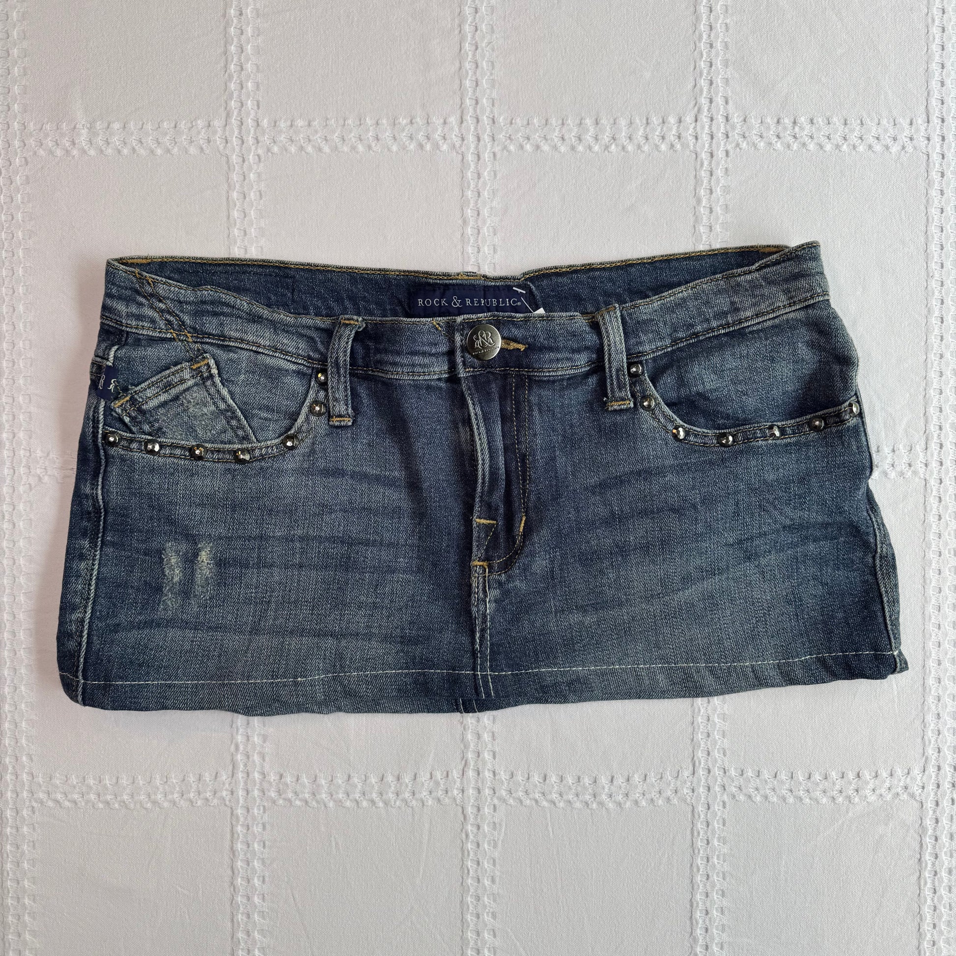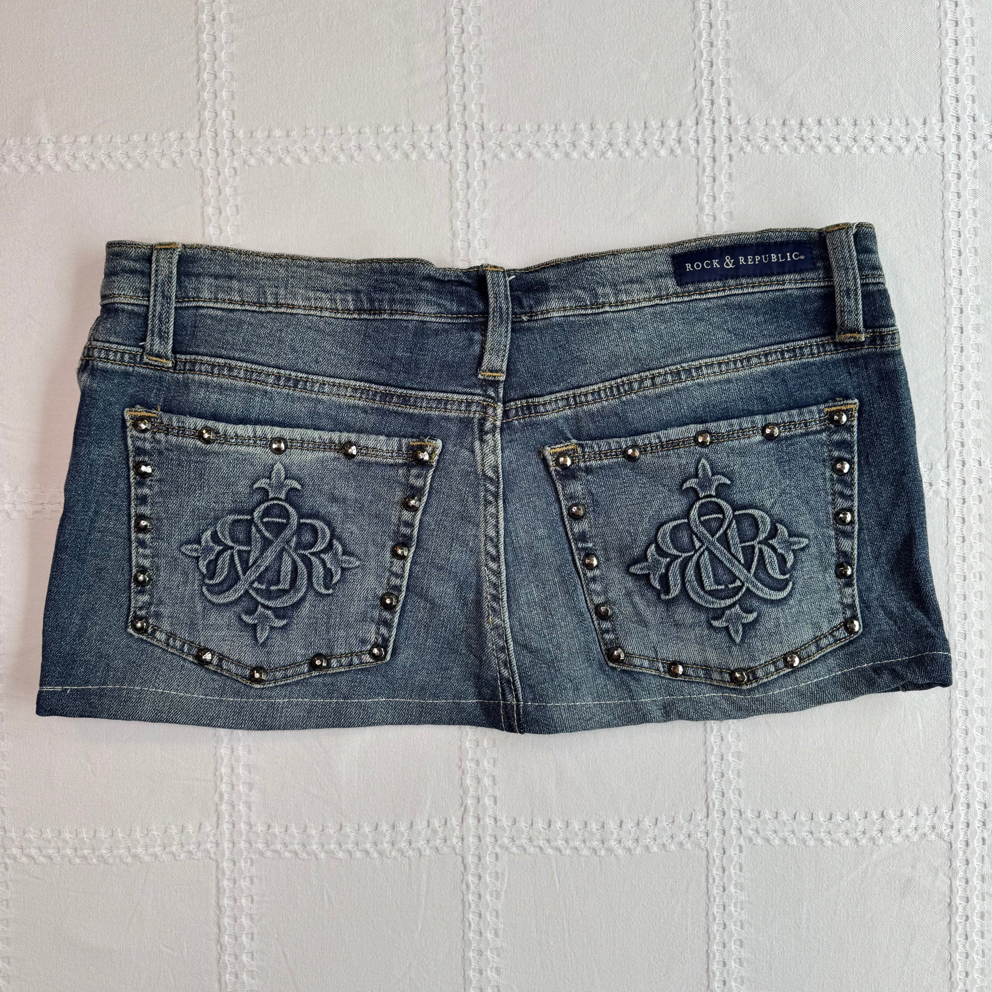 In loveee with this 00s Rock & Republic low rise denim micro mini skirt 🌟 Cute logo print pockets & studded embellishments 🪽