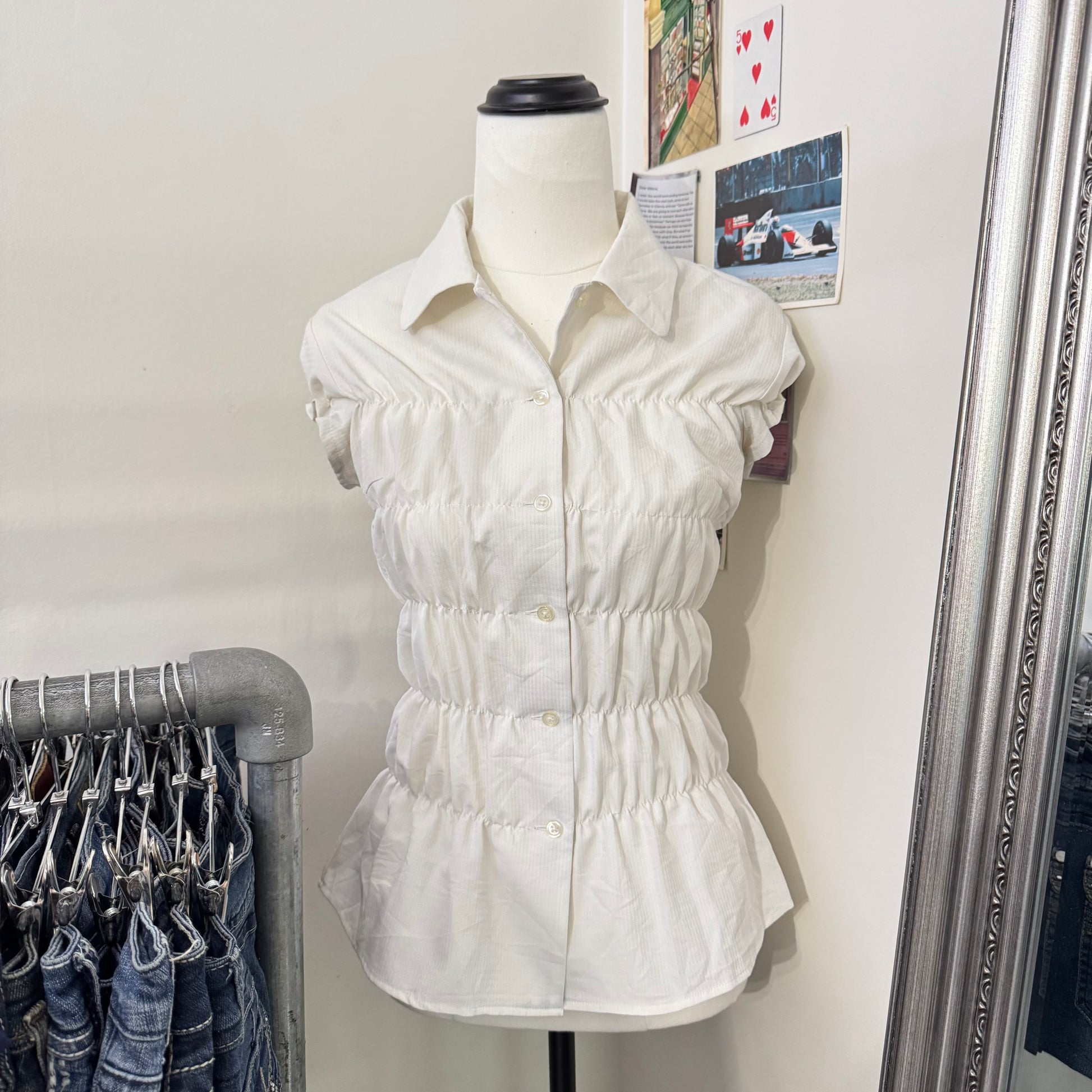 Staple ruched white button up blouse 🍒 So flattering, I’m obsessed with these shirts!